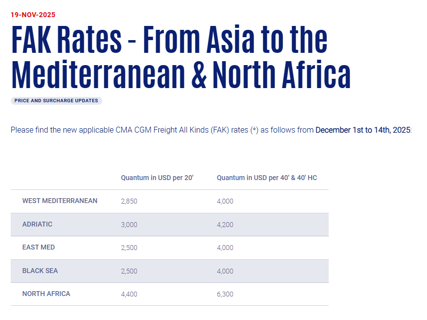 12月1日至12月14日,将上调从远东到地中海和北非的FAK费率,最高每40尺柜6300美元。