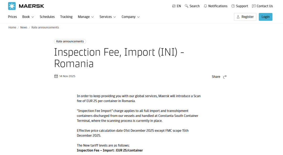 此外还宣布,12月1日起将在罗马尼亚对每个集装箱收取25欧元的扫描费,FMC范围的价格生效日期为12月15日。