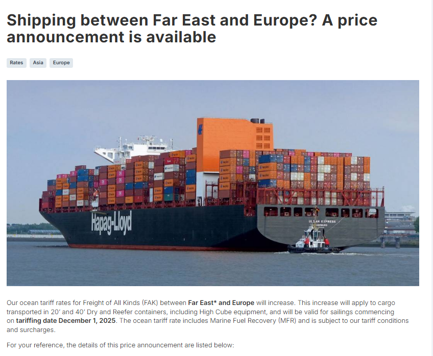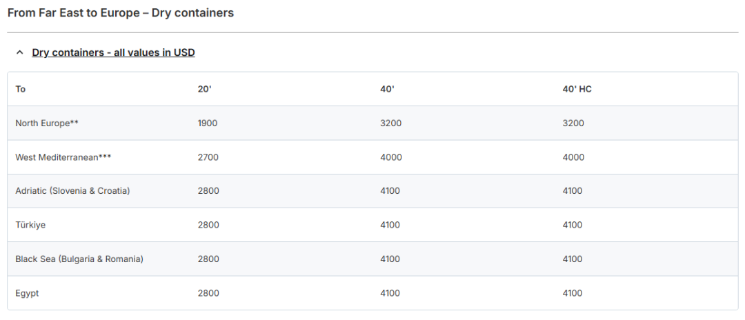 自12月1日起,提高远东和欧洲之间的FAK费率,适用于20英尺和40英尺干箱和冷藏箱运输的货物,包括高箱。